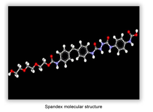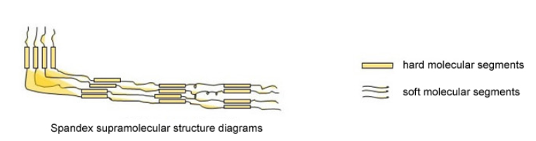 - Spandex is a segmented liner block copolymer having soft and hard molecular segments. The soft segments provides high elasticity while the hard segments acts as virtual cross links that tie all the polymer chains together into an infinite network to ensure high tensile tenacity and recovery. The special molecular structure makes spandex the best elasticity synthetic fiber so far in the world.