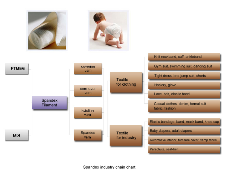 - Spandex, a polyurethane elastic fiber is composed of 85% polyurethane polymer chain segments. The main raw materials of it are PTMEG and MDI.